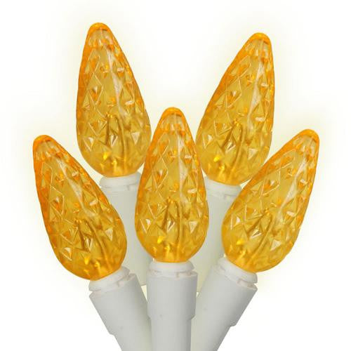 Set of 50 Commercial Grade LED C6 Style Christmas Lights Item #50LC66-Y/W Features: Color: yellow faceted bulbs / white wire Number of bulbs on string: 50 Bulb size: C6 Spacing between each bulb: 6" Lead length: 6" Tail length: 6" Lighted string length: 24.5 feet (7.5m) Total string length: 25.5 feet (7.77m) Wire gauge: 22 Additional Product Features: Heavy duty commercial grade lights Non-replaceable bulbs feature single mold construction, if one light goes out, the rest stay lit Unlike most lights, this type of construction prevents moisture from seeping in and causing corrosion UV protected, water and weather resistant Strand contains 2 rectifiers, this eliminates the shimmer and shake in the light set Full wave set allows you to connect to any control box to fade in or out and/or set to your choice randomly twinkling Bulbs stay cool to the touch Energy efficient bulbs will save up to 90% on energy costs Super bright bulbs guaranteed to light End-to-end connectors allow you to connect multiple sets together (maximum of 210 watts) Comes with 2 spare fuses UL listed for indoor and outdoor use 120 volts, 60Hz, 0.02 amps, 2.4 watts Material(s): durable plastic bulbs/wire