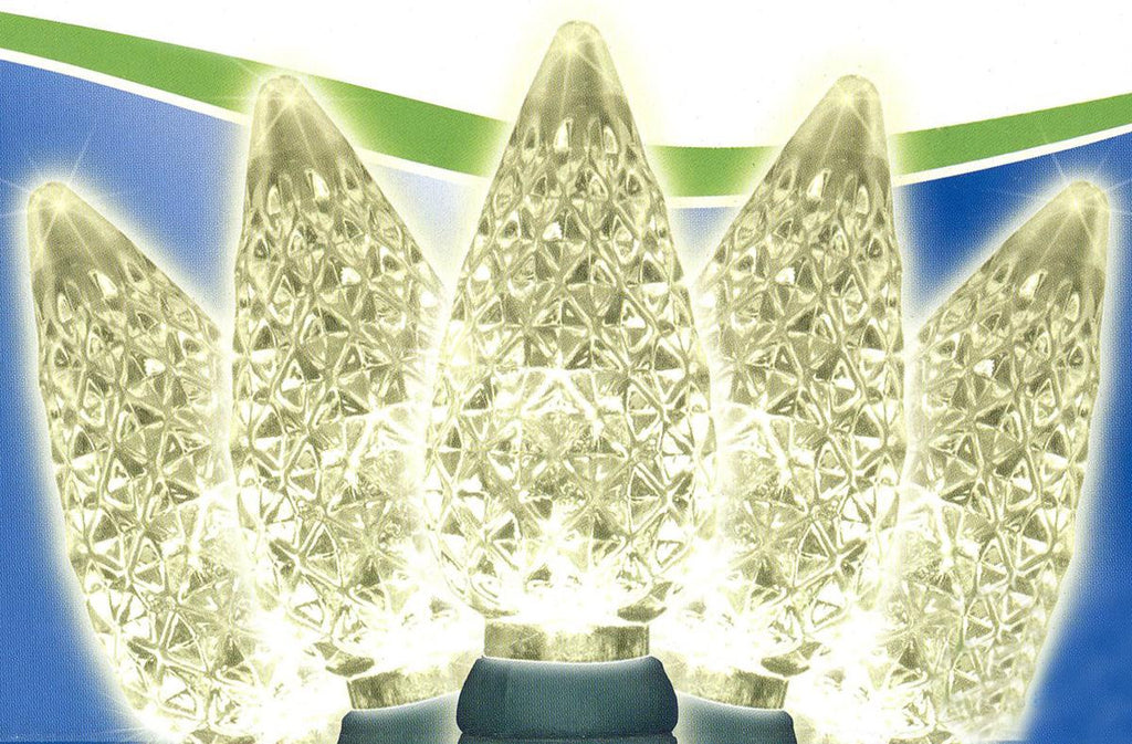 Set of 50 Faceted Pure White LED C6 Christmas Lights - Green Wire